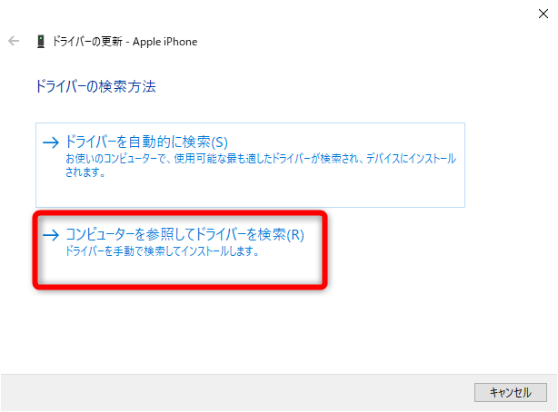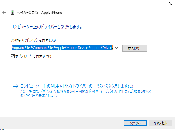 再度デバイスマネージャー→「ポータブルデバイス」右クリック→ドライバーの更新→「コンピューターを参照してドライバーを検索」→「C:\Program Files\Common Files\Apple\Mobile Device Support\Drivers」を選択する。