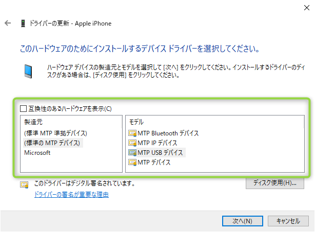 デバイスマネージャー→ポータブルデバイスを展開し、「Apple iPhone」を右クリック→ドライバーの更新→コンピューターを参照してドライバーを検索→コンピューター上の利用可能なドライバーの一覧から選択します