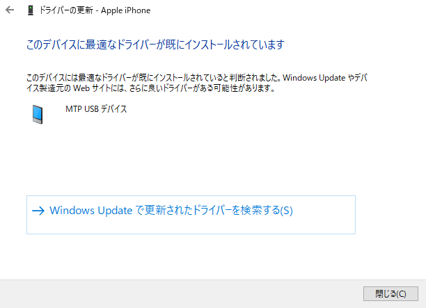 私の場合は、「ドライバーの検索方法」で「ドライバーを自動的に検索」を試した際に、『このデバイスは最適なドライバーがすでにインストールされています』と出たものの、「MTP USBドライブ」となっており、カメラとして認識されているようです。